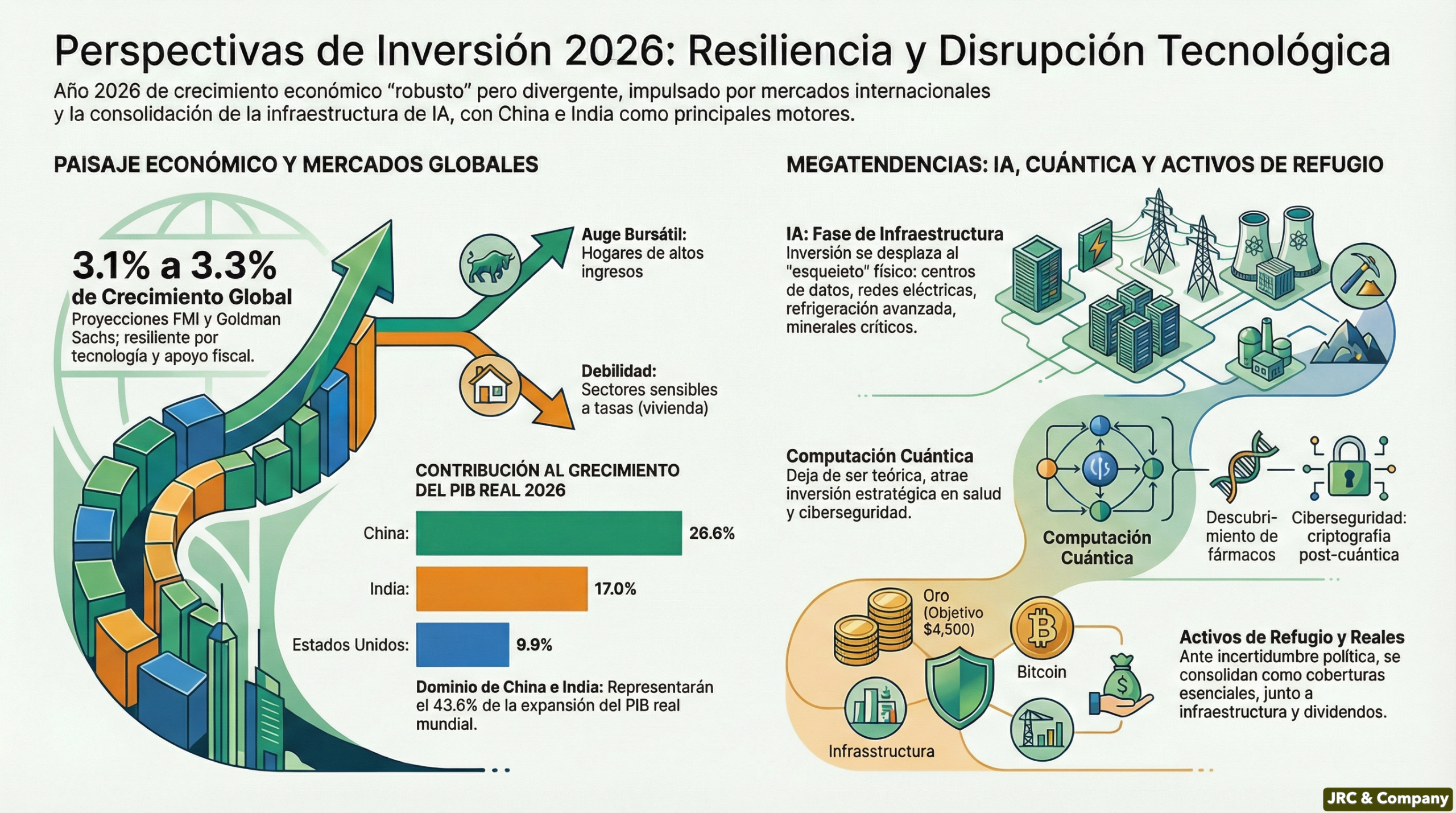 2026 es el año de la resiliencia tecnológica frente a la inercia macroeconómica. Es un ecosistema donde la IA, la computación cuántica y la biología sintética actúan como los motores de combustión de un nuevo orden mundial. El enfoque tradicional de «comprar y mantener» ha sido sustituido por un enfoque de pesas (Barbell): equilibrar el crecimiento secular tecnológico con la solidez defensiva de los activos reales y la infraestructura.